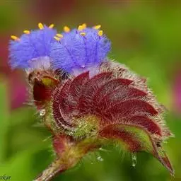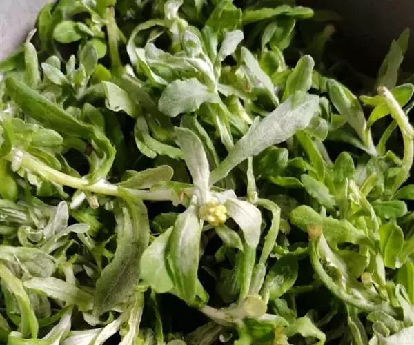 干燥全草呈团块状,灰绿色。茎圆柱形,多分枝,下部节上生褐色须根。叶褶皱,平展者呈线状披针形,长1.5-3.5cm,宽4-6mm,先端渐尖,基部鞘状抱茎,全缘,绿色带紫色条纹。枝上部叶腋内有簇生花1-5朵,花萼绿色,3枚;花瓣蓝紫色;能育雄蕊3,不育雄蕊3枚;子房长圆形无柄。蒴果两端钝,长5-7mm。气微,味甘。以干燥,枝、叶多,色绿者为佳。