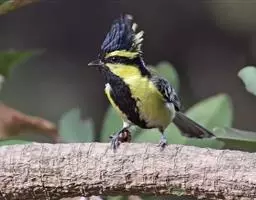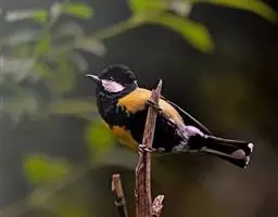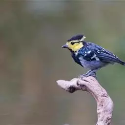 黄颊山雀是雀形目山雀科山雀属鸟类。雄鸟额、头顶和羽冠为具有光泽的黑色;额基、眼先、眉纹、脸颊和耳羽等头颈侧为鲜艳的明黄色;贯眼纹黑色;后颈亦具一黄斑;上体灰黄绿色,羽缘黑色;尾羽黑色具蓝灰色羽缘,基部白色;下体颏、喉至上胸为富有金属光泽的黑色;胸下有一黑色宽中央纵纹,一直延伸至肛周;其余下体白色;胸侧和两胁染黄色或蓝灰色;虹膜暗褐色;喙黑色;脚铅蓝灰色至铅黑色。雌鸟似雄鸟,但上体光泽较弱,胸腹部黑色纵带不明显。黄颊山雀分布于亚洲东南部地区,在中国分布于华中、华南和西南等地。栖息于中低山常绿阔叶林、针叶林和混交林中,也见于山麓疏林灌丛草坡或茶园、果园等地。常成对或小群活动,也和大山雀等其他小型鸟类混群,活跃地在乔灌木枝叶间飞翔跳跃。主食鳞翅目和鞘翅目等昆虫,兼食植物种实。繁殖期在4-6月,营巢于树洞、岩隙或墙缝中。窝卵数为3-7枚,卵灰白色且有红褐斑,雏鸟晚成。黄颊山雀被列入中国林业局200