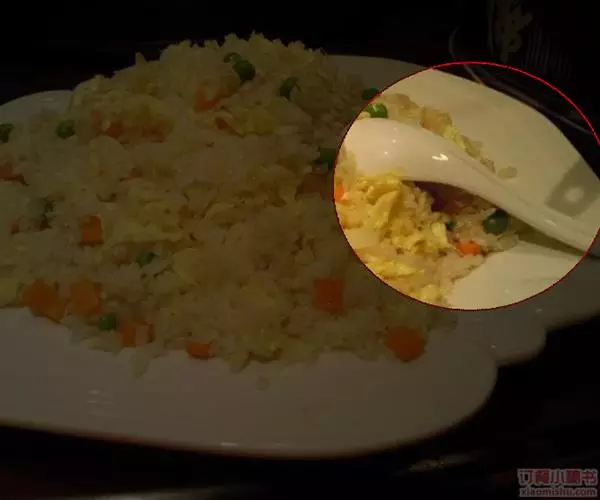 原料:熟虾肉40克,叉烧细丁80克,冬菇丁20克,葱花10克,净蛋80克,油20克,精盐2克,味精2克,白饭300克。