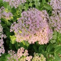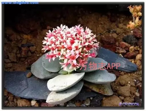 叶子表面宽厚,富肉质感且带有磨纱质感,看像石头质地;开红色小花,生于植株顶部,倒伞形密生,形状像花球一样。
