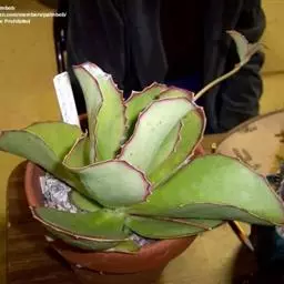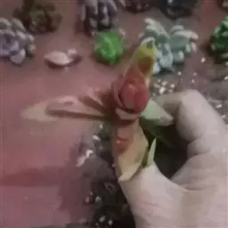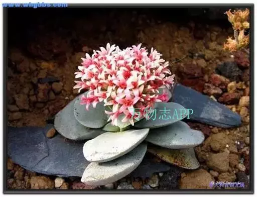 叶子表面宽厚,富肉质感且带有磨纱质感,看像石头质地;开红色小花,生于植株顶部,倒伞形密生,形状像花…