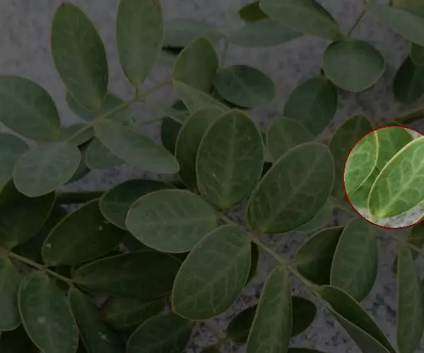 叶长7-12厘米,有小叶3-4对;叶柄长2.5-4厘米;小叶倒卵形或倒卵状长圆形,膜质,长2.5-3.5厘米,宽约1.5厘米,顶端圆钝,基部渐狭,偏斜,下面粉绿色,侧脉纤细,在近边缘处呈网结;在最下方的一对小叶间有黑褐色线形而钝头的腺体1枚。