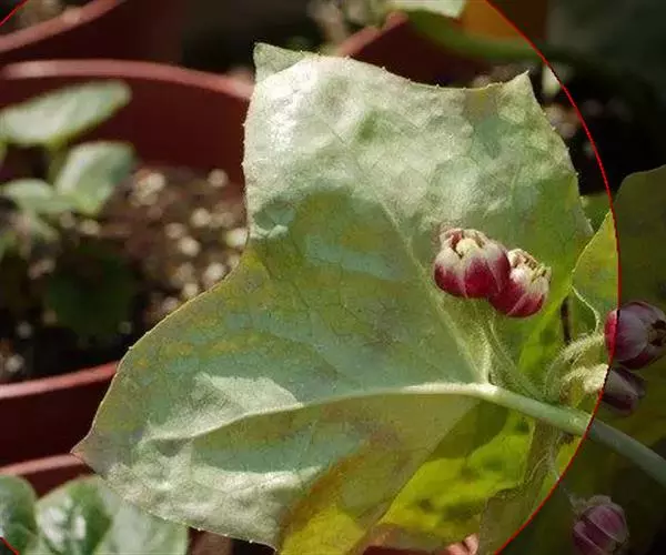 花2-5朵着生于叶基部处,无花序梗,簇生状;花梗长1-2厘米,下弯,疏生白色柔毛;萼片6,长圆状披针形,长2-2.5厘米,宽2-5毫米,先端渐尖,外面被柔毛,内面无毛;花瓣6,淡赭红色,长圆状条带形,长4-5厘米,宽0.8-1厘米,无毛,先端圆钝;雄蕊6,长约2厘米,花丝长约8毫米,花药长约1.2厘米,药隔先端显著延伸;雌蕊长约9毫米,子房坛状,花柱长约2毫米,柱头膨大呈盾状。浆果小,圆球形。花期4-6月,果期6-9月。