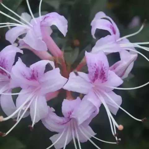 顶生总状伞房花序,有花8-10朵,有香味;总轴长2-2.5厘米,淡红绿色,有稀疏的白色腺体;花梗粗壮,长2.5-3.5厘米,淡绿带紫红色,具白色有柄腺体;花萼小,浅碟形,长1.5-2.3毫米,裂齿5,不整齐;花冠宽漏斗状钟形,变化大,长3-5厘米,直径5-7厘米,淡红色或白色,内面基部有白色微柔毛,外面有稀少的白色腺体,裂片7-8,近于圆形,长约2厘米,宽2.4厘米,顶端有缺刻;雄蕊13-16(-17),不等长,长2-3厘米,花丝基部有白色微柔毛,花药长圆形,白色至浅褐色,长约3毫米;子房长圆柱形,淡绿色,长约6毫米,密被白色有柄腺体,花柱淡白绿色,长3.4-4厘米,通体有白色短柄腺体,柱头大,头状,黄绿色,宽约5毫米。