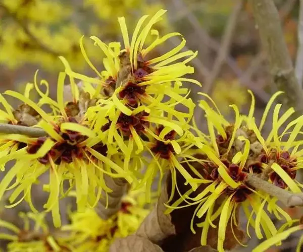 金缕梅(Hamamelis mollis Oliver ),别名木里香、牛踏果,蔷薇目、金缕梅科、金缕梅属落叶灌木或小乔木,高达8米;嫩枝有星状绒毛;老枝秃净;芽体长卵形,宽倒卵圆形叶 形美丽。2月前后先叶开放,花数朵簇生叶腋,色金黄,其金瓣如缕,翩翩起舞,婀娜多姿,早春开花,迎雪怒放,状似蜡梅,故名。由于其耐寒能力又名“忍冬花”。长江流域各省均有分布。