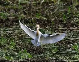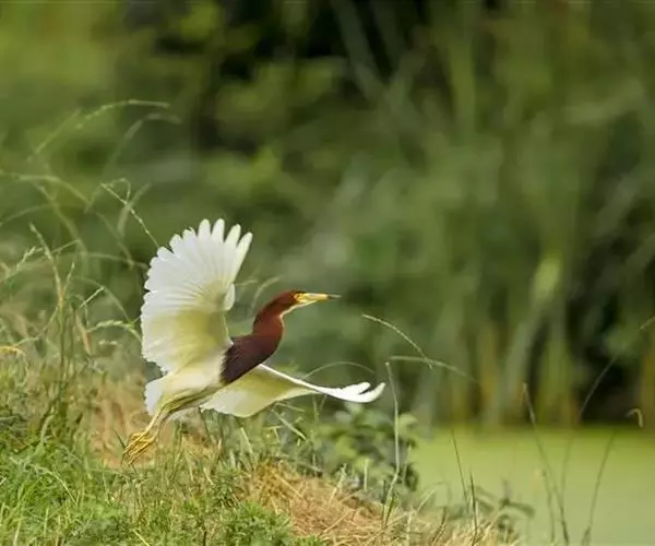 池鹭(学名:Ardeola bacchus)系典型涉禽类,体长约47厘米,翼白色、身体具褐色纵纹的鹭。繁殖羽:头及颈深栗色,胸紫酱色。冬季:站立时具褐色纵纹,飞行时体白而背部深褐。虹膜褐色;嘴黄色(冬季);腿及脚绿灰色。通常无声,争吵时发出低沉的呱呱叫声。栖息于稻田、池塘、沼泽、喜单只或3-5只结小群在水田或沼泽地中觅食,性不甚畏人。食性以鱼类、蛙、昆虫为主,幼雏与成鸟的食物成分相类似。繁殖期营巢于树上或竹林间,巢呈浅圆盘状,由树枝、杉木枯枝、竹枝、茶树枝及菝葜藤等组成,巢内无其他铺垫物。5月上、中旬产卵,每窝产卵3-6枚。分布于孟加拉国至中国及东南亚。越冬至马来半岛、印度支那及大巽他群岛。
