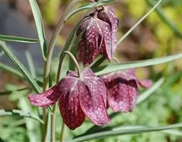 植株全长25-30厘米,茎约1/3埋于地下。鳞茎长5-6厘米,宽1厘米,近基部一侧常有几个扁球形小鳞茎。叶2枚,对生于植株中部以下,椭圆形或宽披针形,长10-11厘米,宽2.5-6.5厘米,先端具短尖头或近急尖,基部楔形,柄长3-4厘米。花单朵顶生,俯垂;花被片披针形,长3.5-5厘米,宽7-11毫米,紫红色,下部有近三齿状的黑色斑纹;花被片内面一基部有4个胼胝体,两侧各有一个近卵状半圆形的耳;花丝钻形,不等长;花药近狭矩圆形,长5-7毫米;花柱向上端稍增粗,具3裂柱头。花期4-5月。