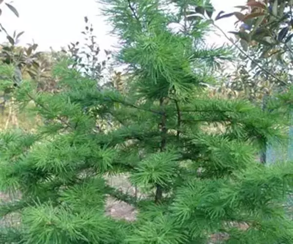 乔木,高达40米,胸径达1.7米;树干通直,树皮粗糙,灰褐色,裂成不规则的鳞片状块片;枝平展,树冠宽塔形;一年生长枝淡红褐色或淡红黄色,无毛,有光泽,二、三年生枝淡黄灰色或淡褐灰色,稀淡紫褐色,老枝及短枝呈灰色、暗灰色或淡褐灰色;矩状短枝生长极慢,有密集成环节状的叶枕。叶条形,柔软,镰状或直,上部稍宽,长2~5.5厘米,宽1.5~4毫米(幼树及萌生枝之叶长达7厘米,宽5毫米),先端锐尖或尖,上面绿色,中脉微明显,下面蓝绿色,中脉明显,每边有5~14条气孔线,气孔带较中脉带为宽或近于等宽;长枝之叶辐射伸展,短枝之叶簇状密生,平展成圆盘形,秋后叶呈金黄色。