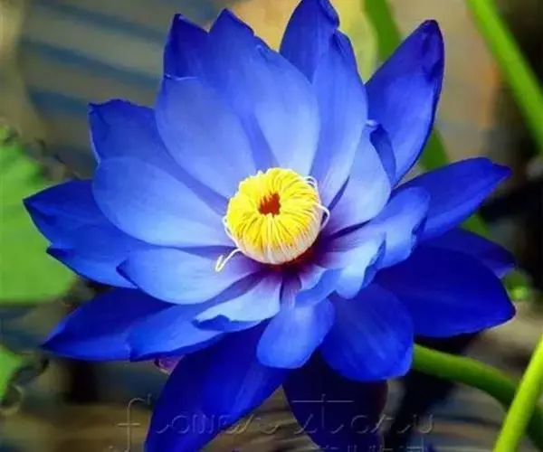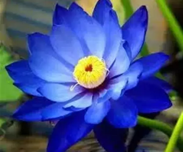 花心鲜黄色,花朵浅蓝色。花瓣15-20枚,花径15厘米,花瓣星状,顶端蓝色较深,基部渐淡,雄蕊金黄。萼片狭窄,呈线形或长披针形。雄蕊比花瓣短,花药条形,柱头具5-8辐射线。傍晚开花,午前闭合,花有香气。 [1-3]