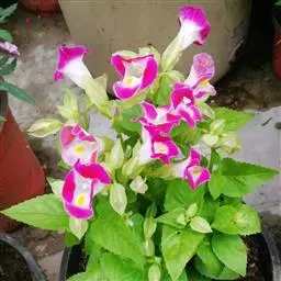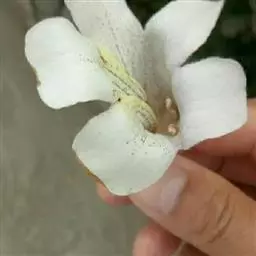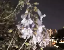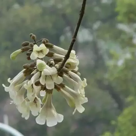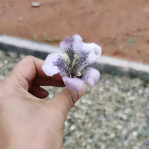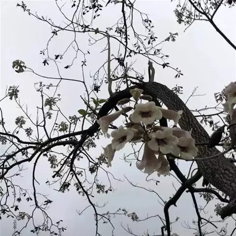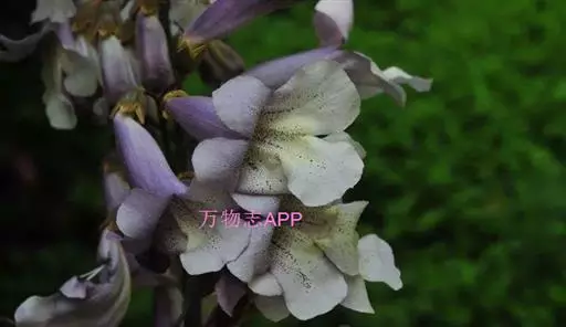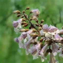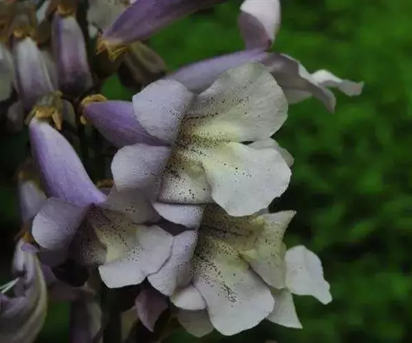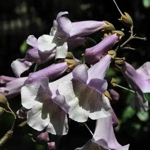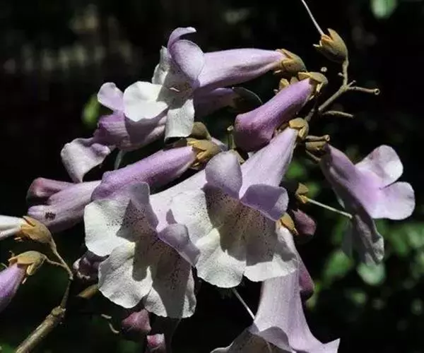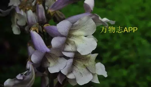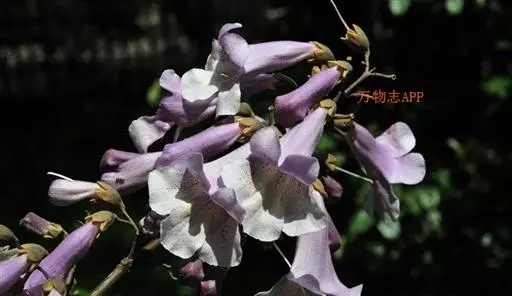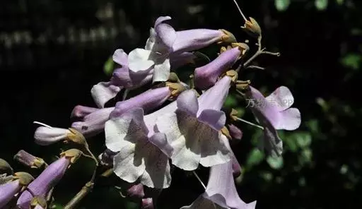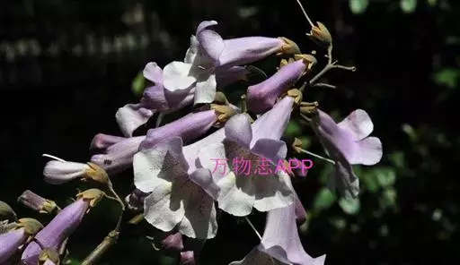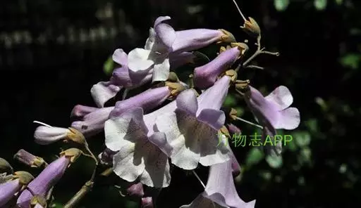 花序枝的侧枝不发达,故花序金字塔形或狭圆锥形,长约30厘米,小聚伞花序的总花梗长8-20毫米,几与花梗等长,有花3-5朵,稀有单花;萼倒圆锥形,长16-20毫米,基部渐狭,分裂至1/3左右成5枚卵状三角形的齿,管部的毛易脱落;花冠漏斗状钟形,紫色至粉白色,长7-9.5厘米,管在基部以上稍弓曲,外面有腺毛和星状毛,内面无毛而有紫色细小斑点,檐部略作2唇形,直径4-5厘米;雄蕊长达25毫米;子房和花柱有腺,花柱长30-35毫米。蒴果卵形,稀卵状椭圆形,长3.5-5厘米,有星状绒毛,宿萼碟状,顶端具长4-5毫米的喙,果皮厚1-2.5毫米;种子连翅长约4-5毫米。花期4-5月,果期秋季。