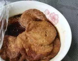 7、再将炸好的山芋倒入咖喱卤的锅中,约焖7分钟左右,用漏勺捞出,放在另一容器中,然后,把咖喱鸡块的卤倒入瓷容器中。