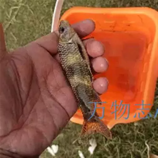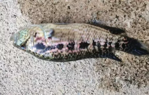 淡水石斑鱼图1 淡水石斑鱼体型为纺锤型,口上位。其躯干两侧各有8条黑纹,垂直黑条纹中央有较黑的色素块。胸鳍淡黄色,腹鳍、背鳍、臀鳍皆具有黑色条纹,尾鳍黑色条纹与身体垂直。除黑白条纹外,成鱼体表略带黄色,体色随外界水环境及生殖期间起适应性变化。繁殖时,雄鱼体色较黑,雌鱼体色较淡,并带有黄色,腹鳍胸位,尾鳍圆尾型,具生殖突。幼鱼眼眶为红色,成鱼眼眶为银黄色。鳞片为圆鳞,较大。侧线鳞断续。鳞式为:背鳍(D)XVIII-12,臀鳍(A)VII-10,腹鳍(V)I-5,胸鳍(P)1-4。