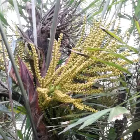 花序生于叶鞘之下,呈圆锥花序式,长约0.8米,具2-3次分枝,分枝花序长20-30厘米,其上有8-10个小穗轴,长12-18厘米;花小,卵球形,金黄色,螺旋状着生于小穗轴上;雄花萼片和花瓣各3片,上面具条纹脉,雄蕊6,花药多少丁字着;雌花萼片和花瓣与雄花的略同,子房1室,具短的花柱和粗的柱头。