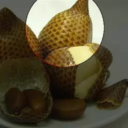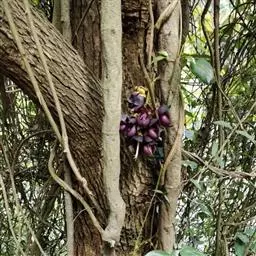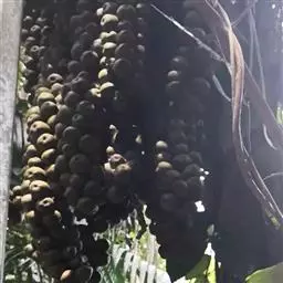 果实略为陀螺形或倒卵形,长约1.5-1.8厘米,直径0.8-1厘米,鲜时土黄色,干时紫黑色,外果皮光滑,中果皮具网状纤维。种子略为倒卵形,胚乳均匀,中央有狭长的空腔,胚侧生。花期5月,果期8月。
