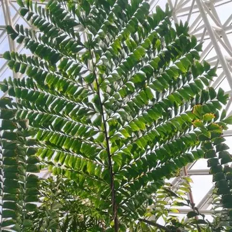 散尾葵为丛生灌木,高2-5米,茎粗4-5厘米,基部略膨大。叶羽状全裂,平展而稍下弯,长约1.5米,羽片40-60对,2列,黄绿色,表面有蜡质白粉,披针形,长35-50厘米,宽1.2-2厘米,先端长尾状渐尖并具不等长的短2裂,顶端的羽片渐短,长约10厘米;叶柄及叶轴光滑,黄绿色,上面具沟槽,背面凸圆;叶鞘长而略膨大,通常黄绿色,初时被蜡质白粉,有纵向沟纹。