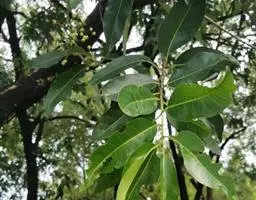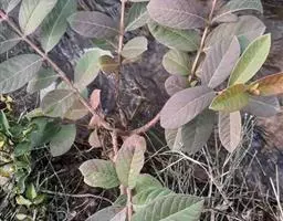 常绿灌木,成长缓慢,树高4-15米,枝梢分枝与成枝能力较强,树姿开张,树冠为自然圆头形。根系分布较浅,深度小于70厘米,以须根为主。树皮细薄,呈灰白色或浅褐色至微红色,具有缓慢脱落特性;果实采收后至萌发新芽期间,老旧树皮会剥落。叶对生,叶柄短,有茸毛,叶片革质,深绿色有光泽,披针形或椭圆形。