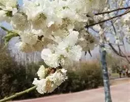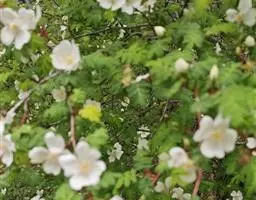 复伞房花序,直径3-4厘米,多花密集;总花梗和花梗均光滑无毛,花梗长5-7毫米;苞片膜质,披针形,边缘有腺齿;花直径1.2-1.5厘米;萼筒钟状,外面无毛;萼片三角卵形或三角披针形,长2-4毫米,比萼筒短,先端尾状渐尖,全缘,两面均无毛;花瓣近圆形,直径约5毫米,白色;雄蕊20,比花瓣稍短;花柱4-5,柱头头状,子房上部有稀疏柔毛。果实球形,直径8-10毫米,金黄色,果肉粉质;萼片宿存,反折;小核4-5,内面两侧有凹痕。花期5-6月,果期8-9月。