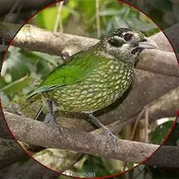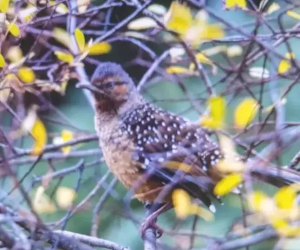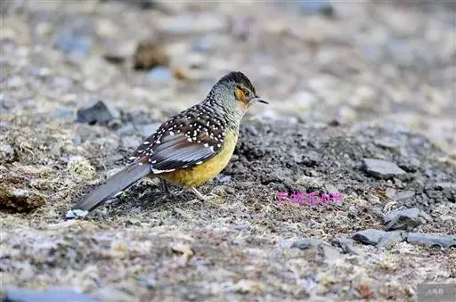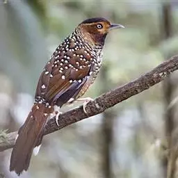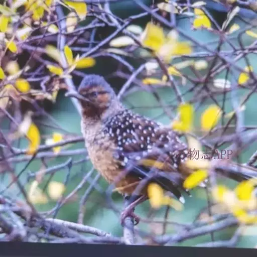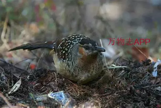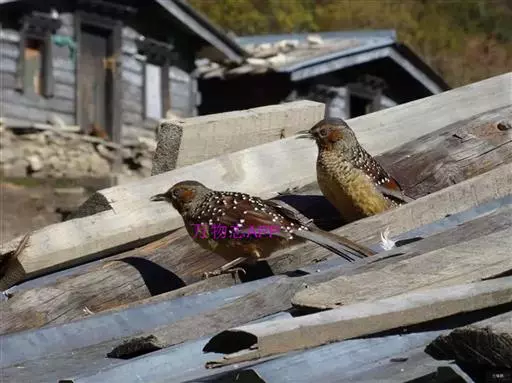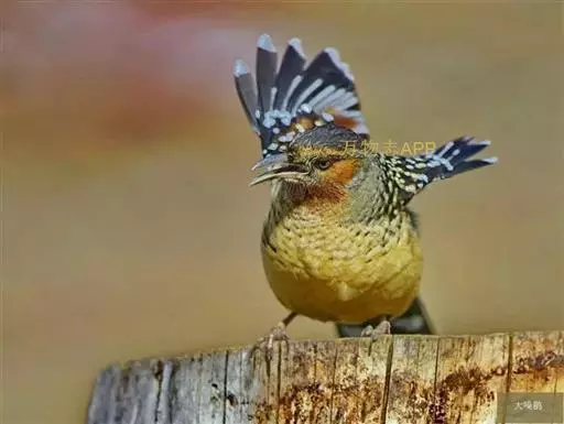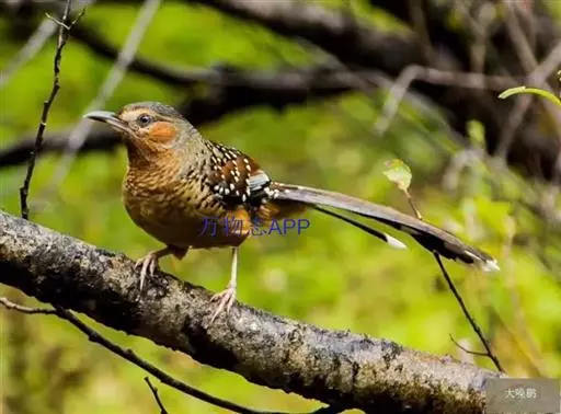 大噪鹛(学名:Garrulax maximus):中型鸟类,体长32-36厘米。额至头顶黑褐色,背栗褐色满杂以白色斑点,斑点前缘或四周还围有黑色。初级覆羽、大覆羽和初级飞羽具白色端斑。尾特长,均具黑色亚端斑和白色端斑。颏、喉棕褐色,喉具棕白色端斑和窄的黑色亚端斑,其余下体棕褐色。野外特征极明显,容易识别。相似种眼纹噪鹛体型较小,尾亦较短,喉和颈侧黑色,胸具黑白相间横斑。区别较明显,野外不难鉴别。