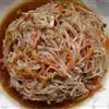 1、将金针菇切一刀,和笋丝一起焯一下,倒出沥净水分;
