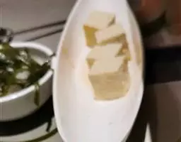 6、切成块就可以了,将一人份吃的虾仁和贝丁下开水锅,焯半分钟左右拿出来。