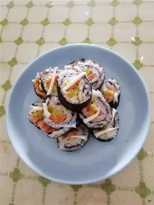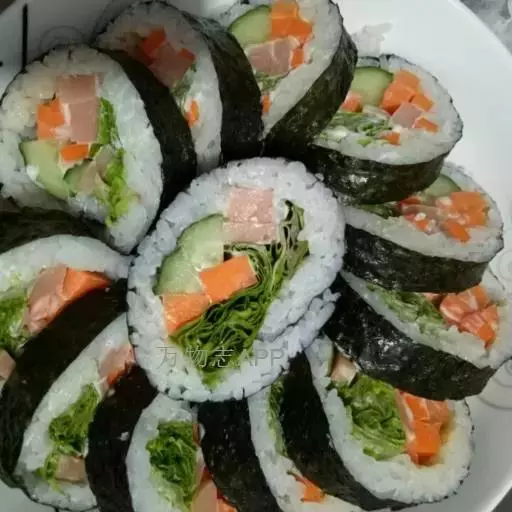 PS:烘过的紫菜包晾凉的米饭,直接就包的米饭只要晾一会儿,不太烫就行。不过一般都是等米饭温度略低于手温时,把紫菜放在寿司竹帘上摊开,把米饭平铺在紫菜上,用勺子弄扁铺平(米饭的厚度大约0.5厘米),最好用专门制作紫菜,日本料理专用的紫菜就可以。铺米饭的过程要尽量快速完成,不然紫菜会因吸收过多水分而变软,无法成型。包裹的时候,米饭不要外露,松紧要适中。(可以在身边摆放一盆水,随时用清水蘸蘸就不会粘手了。)然后压实,并空出上端2厘米左右的紫菜。均匀放入适量蟹柳条,玉米笋和黄瓜。用手卷起竹帘,一定要卷紧,包成饭团。打开时用刀切成1.5cm的小片即可。