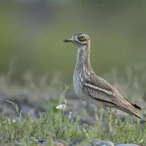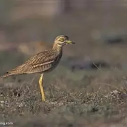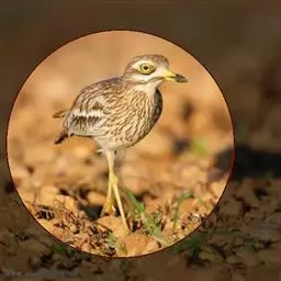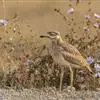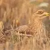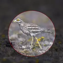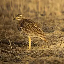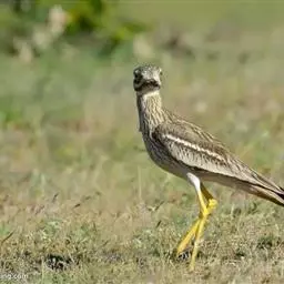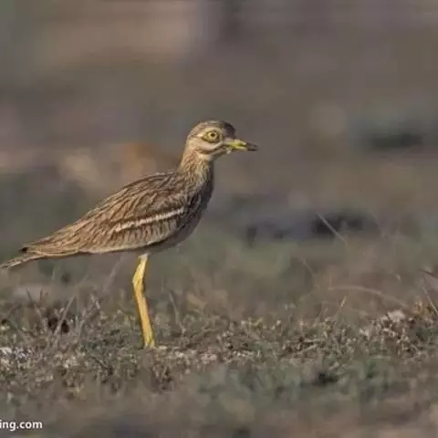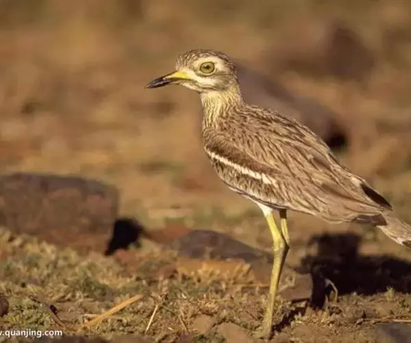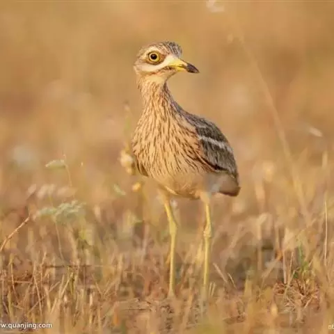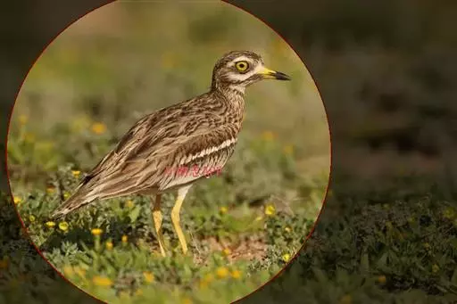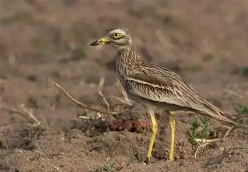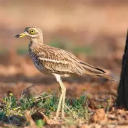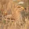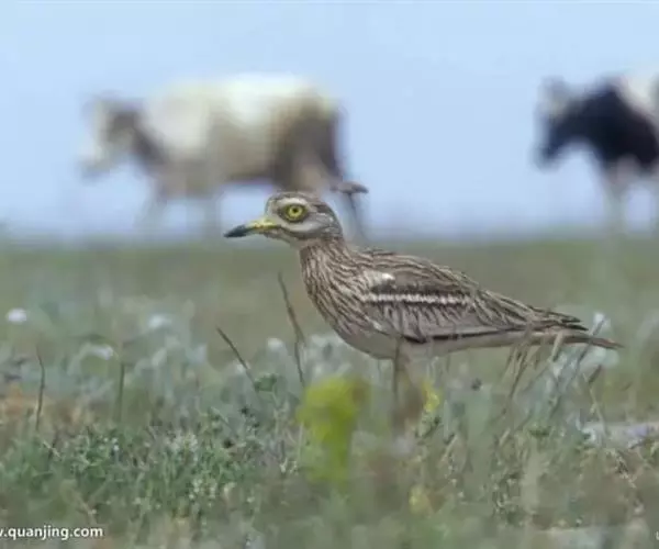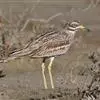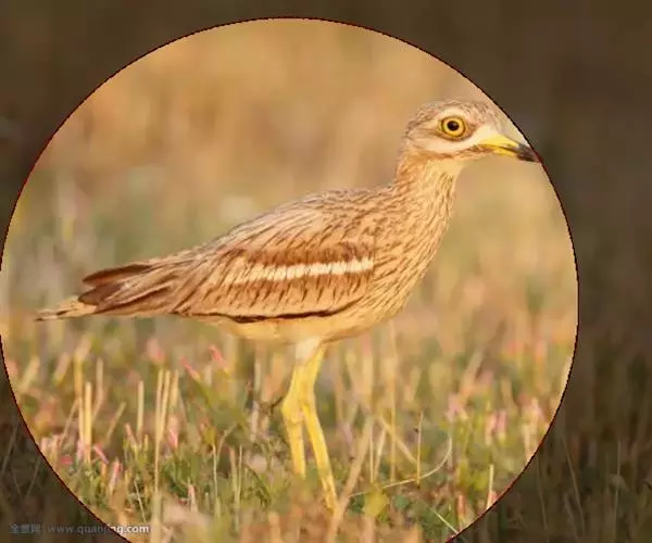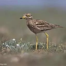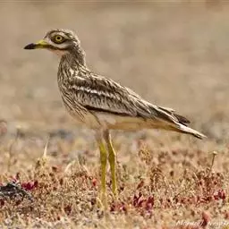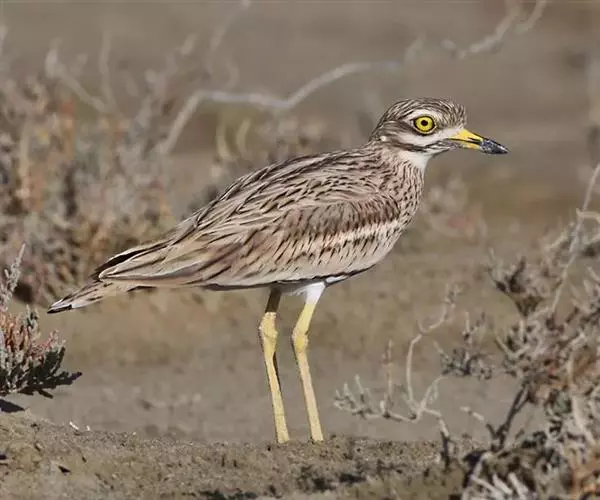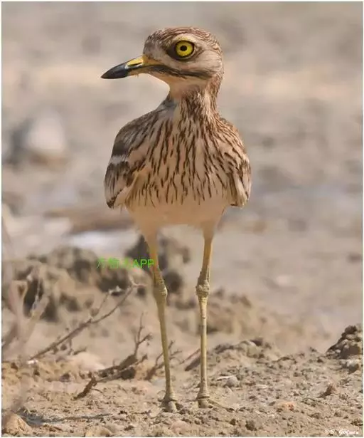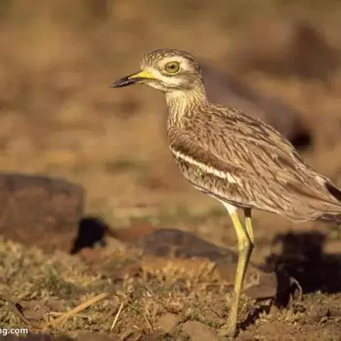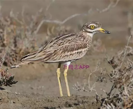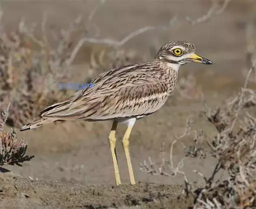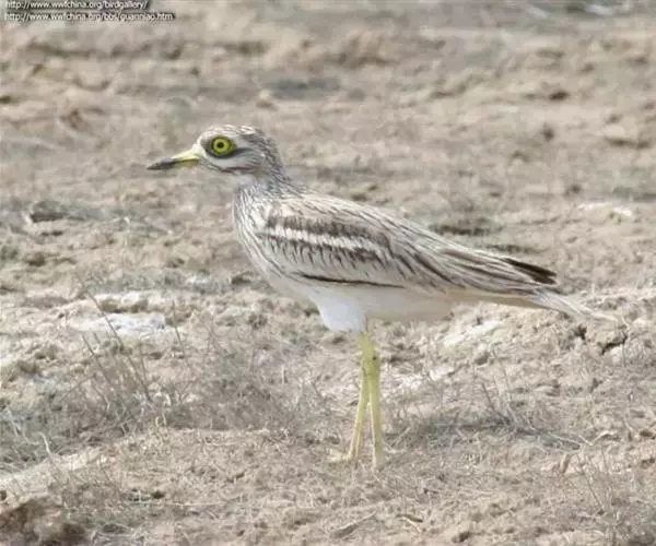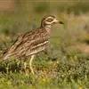 石鸻(学名:Burhinus oedicnemus),是石鸻科、石鸻属的中型涉禽,体长40-45厘米。嘴粗厚、尖端黑色,基部黄色。脚长而粗、黄色,3趾,后趾缺失。上体淡沙灰褐色具黑褐色纵纹,前额和眼先白色。眼特别大、黄色,其外有一窄的黑圈,再外又围有更宽的白色并向后延伸,形成一道显著的白眉,在上下缘的黑色带斑衬托下极为醒目。在背的两侧靠近翅处,有一白色和黑褐色纵带。下体污白色,前颈和胸缀有皮黄灰色亦具黑纹,飞翔时黑色初级飞羽上有白斑,翅下白色。