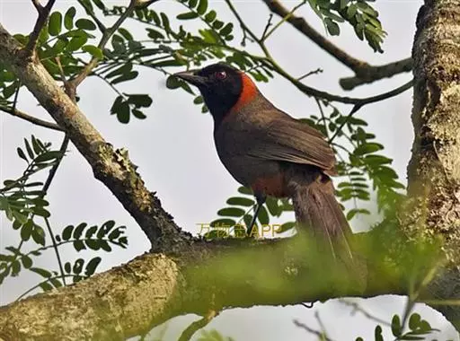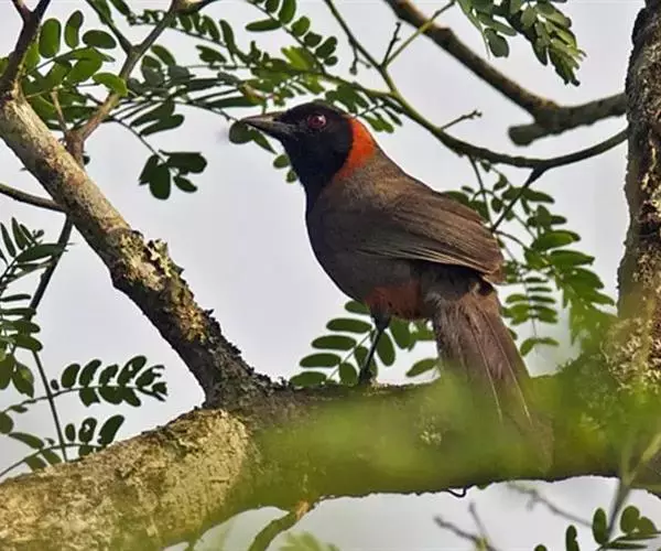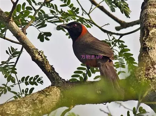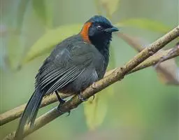 栗颈噪鹛(学名:Garrulax ruficollis)是噪眉科、噪鹛属中型鸟类,体长22-25厘米。头顶至枕暗石板灰色,前额、头侧、颏、喉至上胸黑色,耳后至颈侧有一栗棕色块斑,在头后颈侧极为醒目。上体暗橄榄褐色,两翅黑褐色,初级飞羽外翈沾灰。尾黑色,胸至上腹和两胁棕橄榄褐色,腹中央至尾下覆羽栗棕色。特征极明显,野外不难识别。虹膜朱红色,嘴黑色,脚、趾黑褐色,爪角褐色。