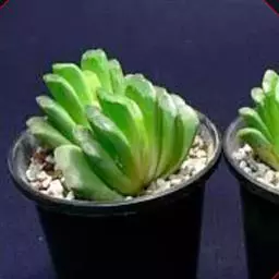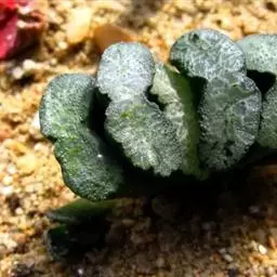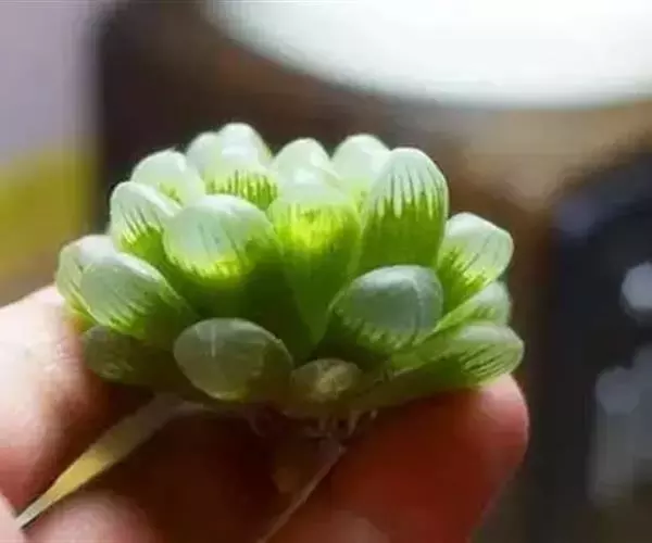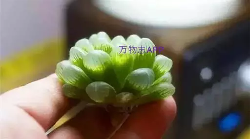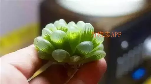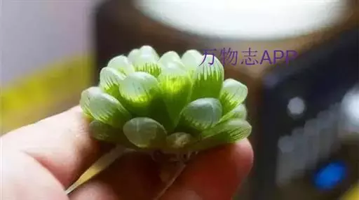 冰灯玉露的株形较大,单株直径有7~10厘米,更长不成群生的植株,其肉质叶顶端非常通透,像冰一样透亮,叶缘有毛刺,但顶端没有毛,肉质叶上端深色线条达不到。由于冰灯玉露基本不出侧芽,致其繁殖速度极慢。