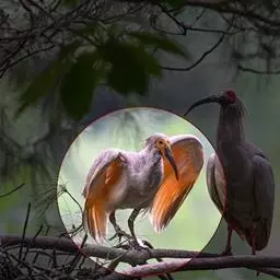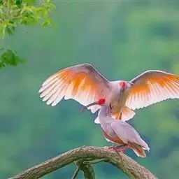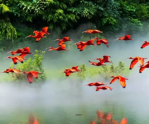 常结成大群,当红鹮一齐飞起时,好像一片红云飘起,景象非常壮观!