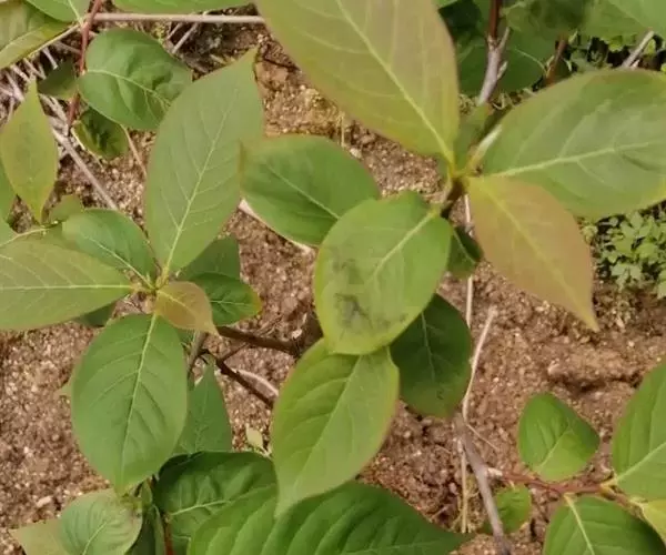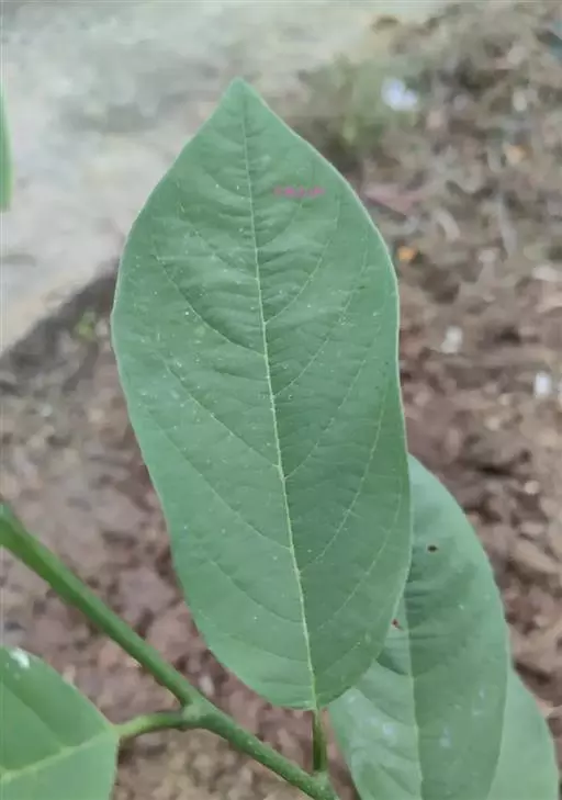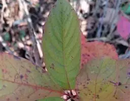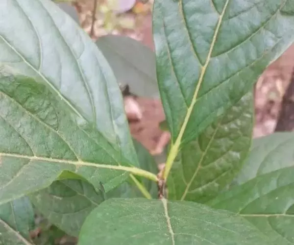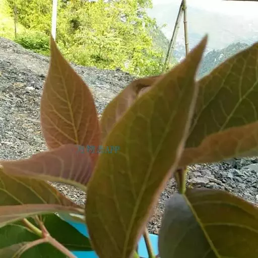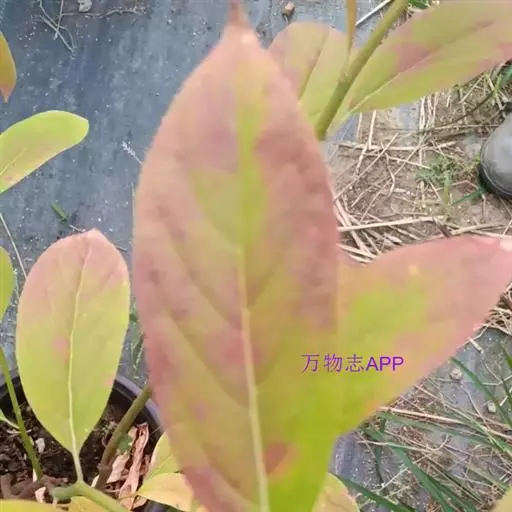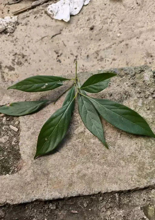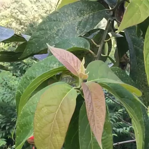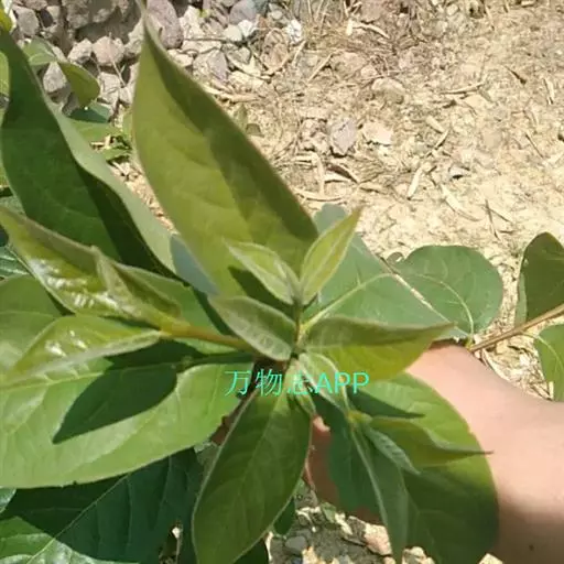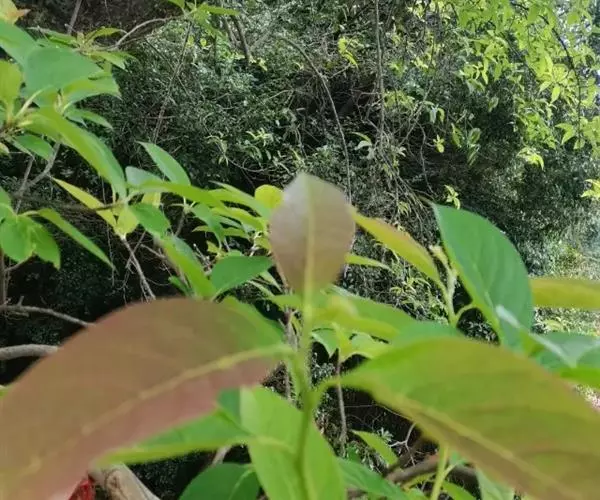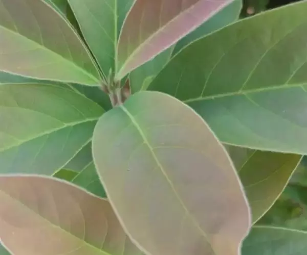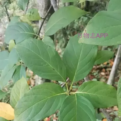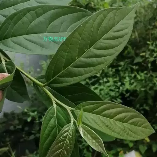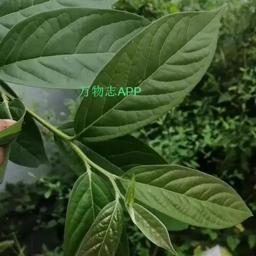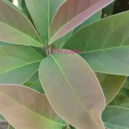 叶纸质或薄革质,互生,椭圆形或长椭圆形,稀卵形或近披针形,长12-15厘米,宽5-6厘米,稀达8厘米,顶端短急锐尖,基部近圆形,边缘略呈浅波状,上面无毛,深绿色,干燥后深紫色,下面淡绿色,有很稀疏的微柔毛,中脉和6-10对侧脉均在上面微现,在下面显著;叶柄淡紫绿色,长1.5-2厘米,上面稍扁平或微呈沟状,下面圆形。