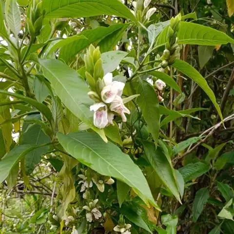 大灌木,高达1-3米;枝圆柱状,灰色,有皮孔,嫩枝密被灰白色微柔毛。叶纸质,矩圆状披针形至披针形,或卵形或椭圆状卵形,长15-20厘米,宽4.5-7.5厘米,顶端渐尖,有时稍呈尾状,基部阔楔形,全缘,上面近无毛,背面被微柔毛;中脉在上面具槽,侧脉每边约12条;叶柄长1.5-2厘米。茎叶揉后有特殊臭气。穗状花序卵形或稍伸长;花梗长5-10厘米;苞片卵形或阔卵形,长1-3厘米,宽8-15毫米,被微柔毛;小苞片披针形,稍短于苞片,萼裂片5,矩圆状披针形,长约8毫米;花冠白色,有紫色条纹或粉红色,长2.5-3厘米,被柔毛,冠管卵形,长约6毫米;药室椭圆形,基部通常有球形附属物不明显。蒴果近木质,长约0.5厘米,上部具4粒种子,下部实心短柄状。 [1-2]