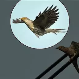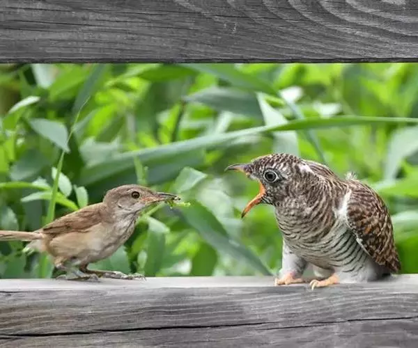 大苇莺在喂养体形比自己还大的大杜鹃雏鸟