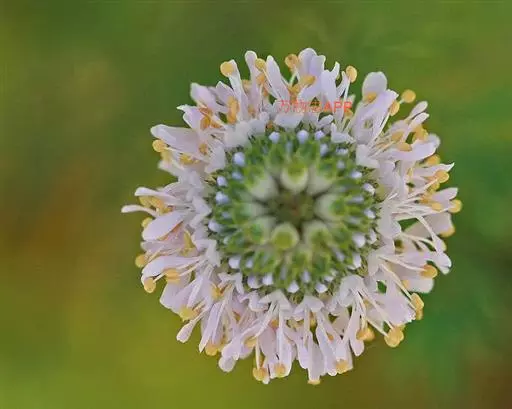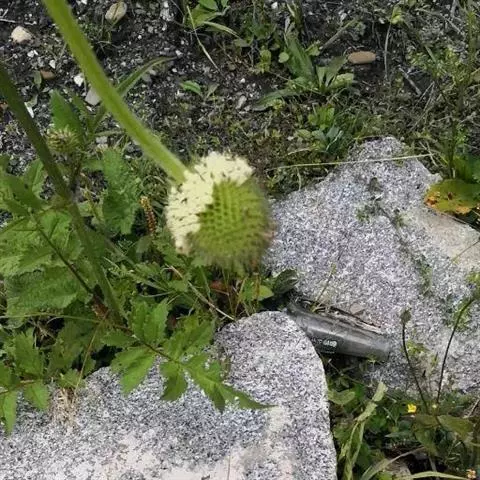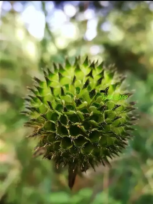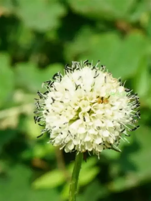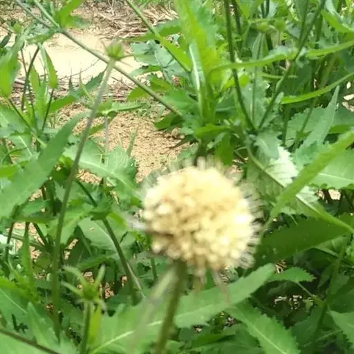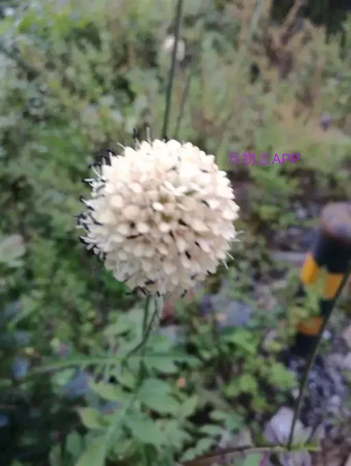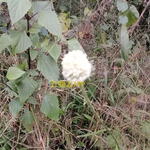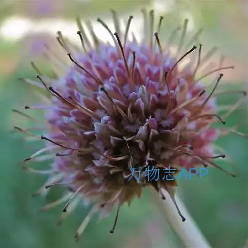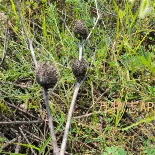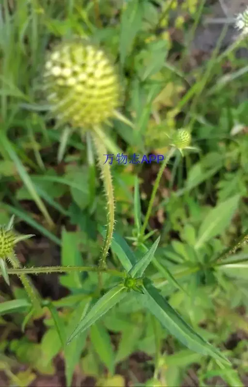 头状花序球形,径2-3厘米,总花梗长达55厘米;总苞片5-7枚,叶状,披针形或线形,被硬毛;小苞片倒卵形,长7-11毫米,先端稍平截,被短柔毛,具长3-4毫米的喙尖,喙尖两侧密生刺毛或稀疏刺毛,稀被短毛;小总苞四棱倒卵柱状、每个侧面具两条纵纵沟;花萼四棱、皿状、长约1毫光、不裂或4浅裂至深裂,外面被短毛;花冠淡黄色或白色,花冠管长9-11毫米,基部狭缩成细管,顶端4裂,1裂片稍大,外面被短柔毛;雄蕊4,着生于花冠管上,明显超出花冠,花丝扁平,花药椭圆形,紫色;子房下位,花柱通常短于雄蕊,柱头短棒状。