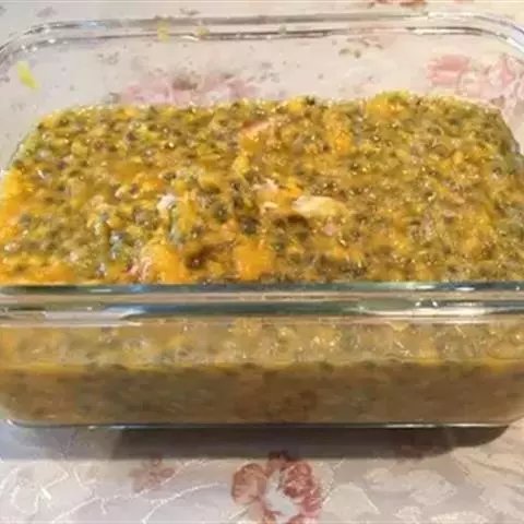 6、拌入挖出来的菠萝肉和菠萝汁;