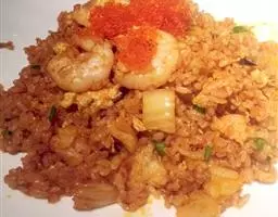 主料:香米饭(蒸熟)250克,鲜菠萝1个,鸡蛋1个,熟腰果仁少许,青红菜椒各1/2个,洋葱半个,鲜虾仁100克,葡萄干少许。
