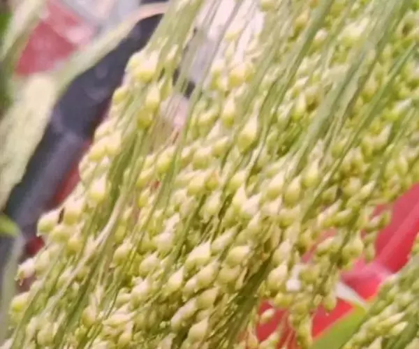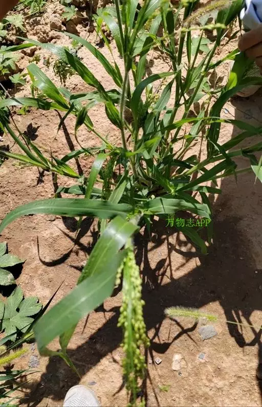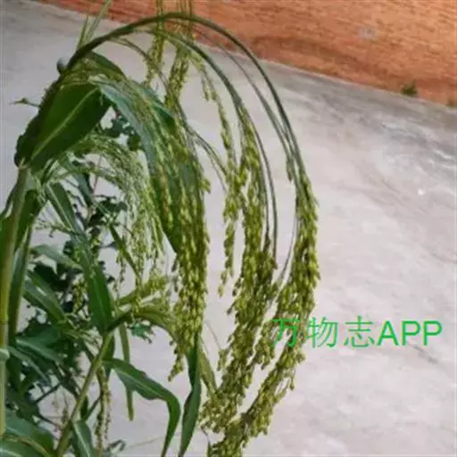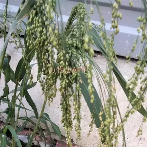 圆锥花序开展或较紧密,成熟时下垂,长10-30厘米,分枝粗或纤细,具棱槽,边缘具糙刺毛,下部裸露,上部密生小枝与小穗;小穗卵状椭圆形,长4-5毫米;颖纸质,无毛,第一颖正三角形,长约为小穗的1/2-2/3,顶端尖或锥尖,通常具5-7脉;第二颖与小穗等长,通常具11脉,其脉顶端渐汇合呈喙状;第一外稃形似第二颖,具11-13脉;内稃透明膜质,短小,长1.5-2毫米,顶端微凹或深2裂;第二小花长约3毫米,成熟后因品种不同,而有黄、乳白、褐、红和黑等色;第二外稃背部圆形,平滑,具7脉,内稃具2脉;鳞被较发育,长0.4-0.5毫米,宽约0.7毫米,多脉,并由1级脉分出次级脉。胚乳长为谷粒的1/2,种脐点状,黑色。花果期7-9月。