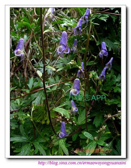 黄草乌(学名:Aconitum vilmorinianum Kom.):毛茛科,乌头属多年生草本植物,块根椭圆球形或胡萝卜形,茎缠绕,叶片坚纸质,五角形,花序有3-6花;苞片线形;萼片紫蓝色,种子三棱形,只在一面密生横膜翅。8-10月开花。