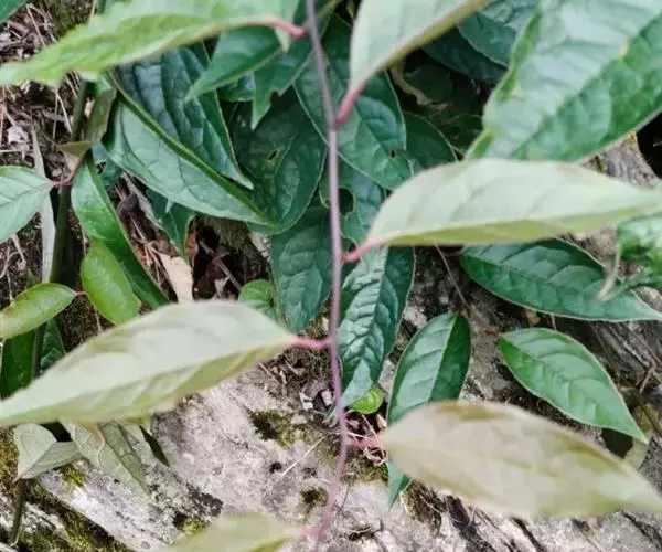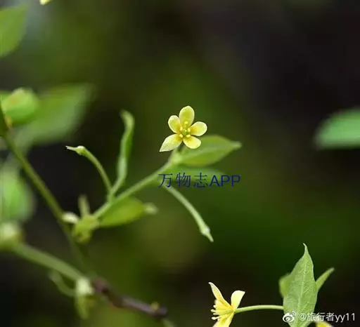 落叶攀援木质藤本;嫩枝绿色,被细柔毛,老枝紫褐色,具白蜡层,常留有木质化成单刺状或双刺状的叶柄基部。芽鳞阔卵形,具缘毛。叶近纸质,卵状椭圆形、卵形或阔卵形,长3.5-9厘米,宽2-4.5厘米,叶面深绿色,中脉有稀疏毛,叶背带白色,脉上被稀疏柔毛,侧脉每边3-5条;叶柄长2-5毫米,被柔毛。