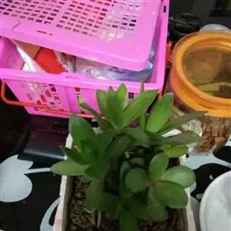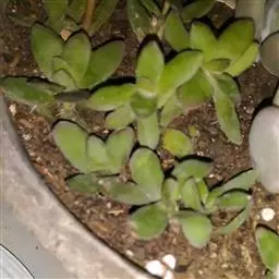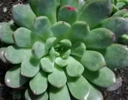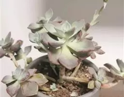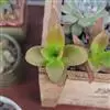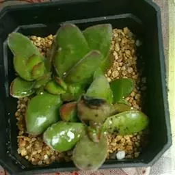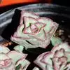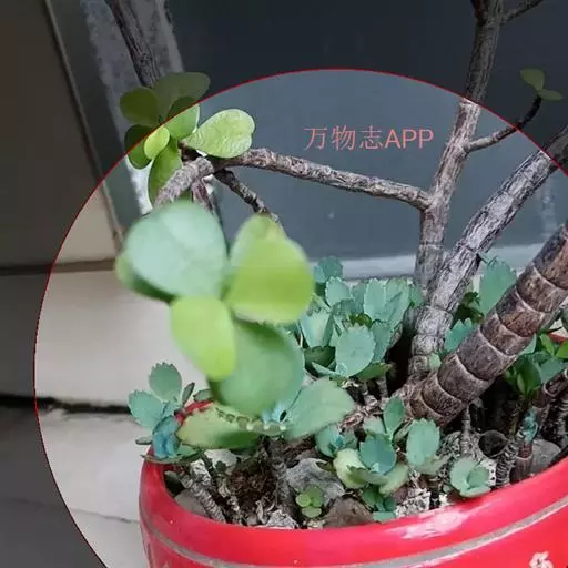 植株呈亚灌木状,高约60厘米,具小分枝,茎肉质,以后稍木质化。肉质叶灰绿 至浅绿色,叶缘稍具红色,交互对生,卵圆状三角形,无叶柄,基部连在一起,幼叶上下叠生,成叶上下有少许间隔。叶长1.5~2.5厘米,宽0.9~1.3厘米,花白色,4~5月开放。