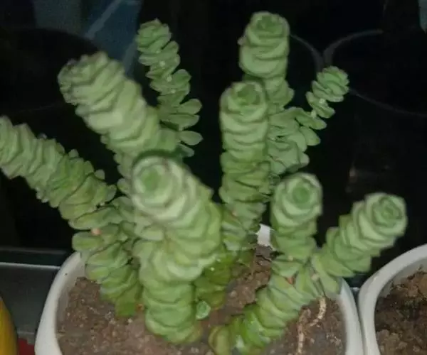 星乙女(学名:Crassula perforata Thunb.)景天科,青锁龙属多年生肉质草本,植株呈亚灌木状,具细小的分枝,茎肉质,以后稍木质化,肉质叶灰绿至浅绿色,交互对生,卵圆状三角形,无叶柄, 基部连在一起,幼叶上下叠生,成叶上下有少许间隔。叶缘稍具红色。花白色4~5月开放。