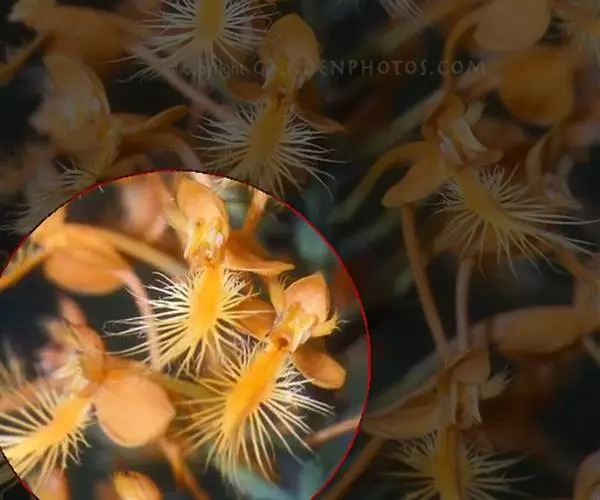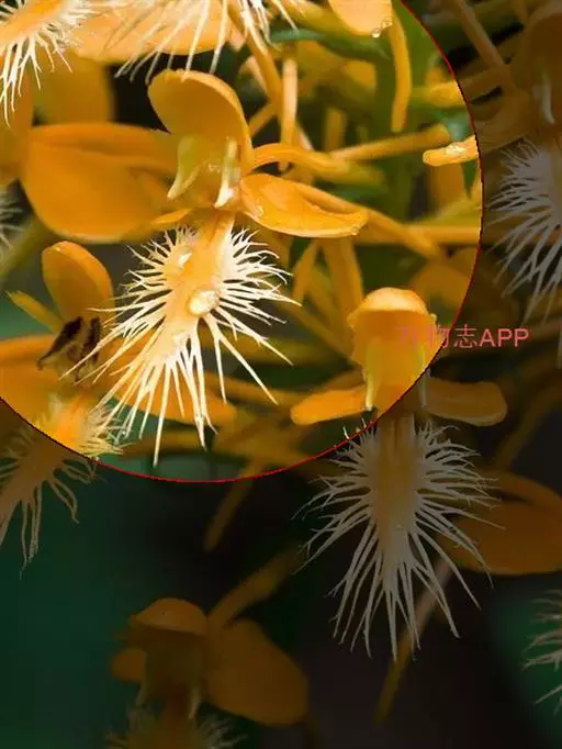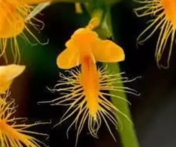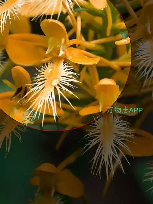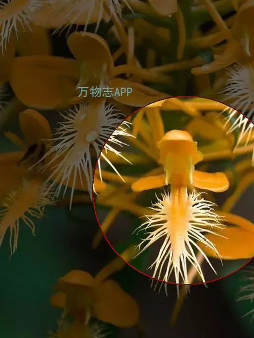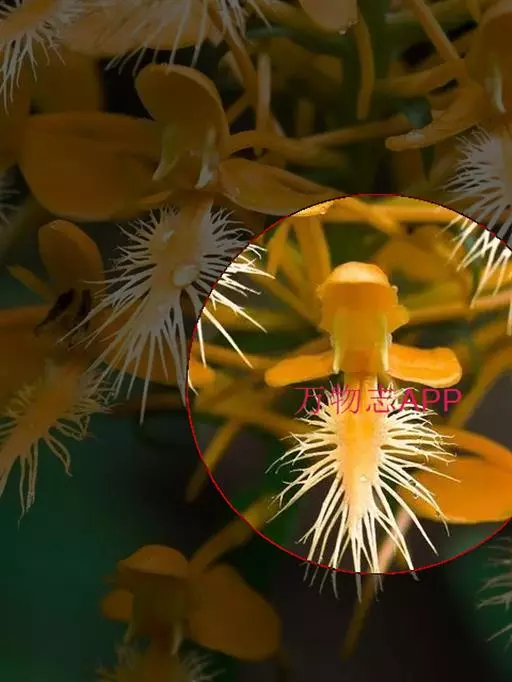花瓣长圆形,长2.5厘米,宽7毫米,先端钝,具7条脉,全缘;唇瓣卵状三角形,长2厘米,宽15毫米,先端稍钝,基部具短爪,上面密布短绒毛,中部以下边缘具短流苏,中部以上(尤其先端)边缘具长而分枝的流苏,先端的流苏比唇瓣长;蕊柱黄色而上端两侧白色,长约3毫米;药帽浅黄白色,狭圆锥形,长约5毫米,密布细乳突,前端边缘稍不整齐。