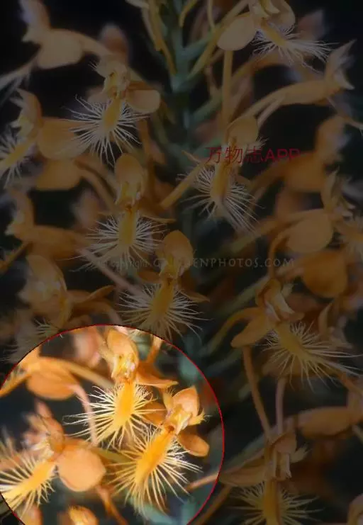 总状花序侧生于去年生无叶的茎上端,近直立,具1-2朵花;花序柄长1-4厘米,基部具4-5枚鞘;鞘膜质,短筒状,套叠,基部的最短,长约2毫米,向上逐渐变长;花苞片膜质,卵状披针形,长7-12毫米,先端近钝;花梗和子房长达5厘米;花质地稍厚,金黄色,开展;中萼片长圆状披针形,长2.5厘米,宽8毫米,先端钝、具7条脉;侧萼片近披针形,长2.5厘米,宽8毫米,先端锐尖,基部歪斜;萼囊短钝,长约3毫米,