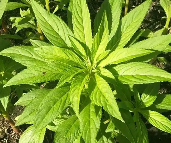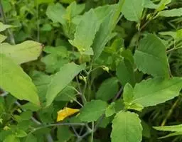 叶互生,最下部叶有时对生;叶片披针形、狭椭圆形或倒披针形,长4-12厘米、宽1.5-3厘米,先端尖或渐尖,基部楔形,边缘有锐锯齿,向基部常有数对无柄的黑色腺体,两面无毛或被疏柔毛,侧脉4-7对;叶柄长1-3厘米,上面有浅沟,两侧具数对具柄的腺体。