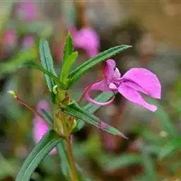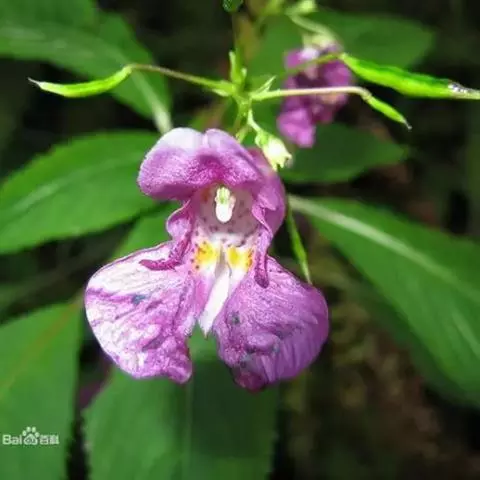 凤仙花 花单生或2-3朵簇生于叶腋,无总花梗,白色、粉红色或紫色,单瓣或重瓣;花梗长2-2.5厘米,密被柔毛;苞片线形,位于花梗的基部;侧生萼片2,卵形或卵状披针形,长2-3毫米,唇瓣深舟状,长13-19毫米,宽4-8毫米,被柔毛,基部急尖成长1-2.5厘米内弯的距;旗瓣圆形,兜状,先端微凹,背面中肋具狭龙骨状突起,顶端具小尖,翼瓣具短柄,长23-35毫米,2裂,下部裂片小,倒卵状长圆形,上部裂片近圆形,先端2浅裂,外缘近基部具小耳;雄蕊5,花丝线形,花药卵球形,顶端钝;子房纺锤形,密被柔毛。蒴果宽纺锤形,长10-20毫米:两端尖,密被柔毛。