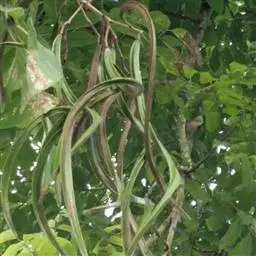 荚果圆柱形,长30-60厘米,直径2-2.5厘米,黑褐色,不开裂,有3条槽纹;种子40-100颗,为横隔膜所分开。花期6-8月;果期10月。