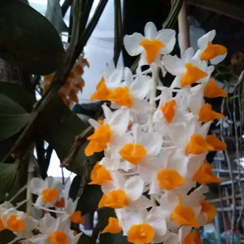 总状花序长18厘米,下垂,疏生6朵花;花苞片淡褐色,宽卵形,凹的,长约8毫米,先端钝,花梗和子房长约18毫米;花具橘子香气,萼片和花瓣白绿色;萼片长圆形,长1.7厘米,宽7.5毫米,先端钝;侧萼片比中萼片稍窄,在基部上方内面具1-3个污褐色横向斑点。