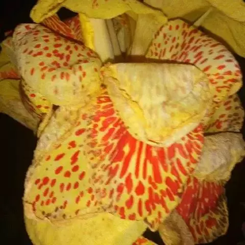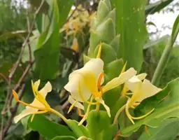 粉美人蕉是一种球根草本植物。根茎延长,株高1.5-2米;茎绿色。叶片披针形,长达50厘米,宽10-15厘米,顶端急尖,基部渐狭,绿色,被白粉,边绿白色,透明;总状花序疏花,单生或分叉,稍高出叶上;苞片圆形,褐色,花黄色,无斑点;萼片卵形,长1.2厘米,绿色;花冠管长1-2厘米;花冠裂片线状披针形,长2.5-5厘米,宽1厘米,直立,外轮退化雄蕊3,倒卵状长圆形,长6-7.5厘米,宽2-3厘米,全缘;唇瓣狭,倒卵状长圆形,顶端2裂,中部卷曲,淡黄色;发育雄蕊倒卵状近镰形,顶端急尖,内卷;花柱狭披针形。蒴果长圆形,长3.5厘米。花期