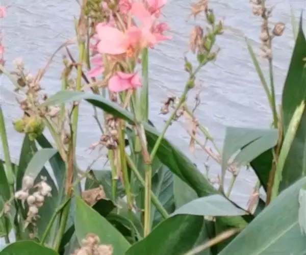 粉美人蕉(学名:Canna glauca L.):是一种球根草本植物。根茎延长,株高1.5-2米;茎绿色。叶片披针形;总状花序疏花,单生或分叉,稍高出叶上;苞片圆形,褐色,花黄色,无斑点;有多种园艺栽培品种,颜色从粉、橙红色及具带红色斑点等。花期:夏、秋。
