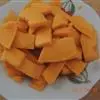 1、南瓜去皮、洗净、切丁,红枣(枸杞)用温水发开待用。