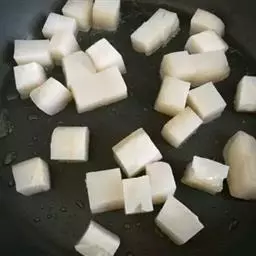 2、锅内放油,加清水、冰糖、少许盐,再放入南瓜翻炒即可。